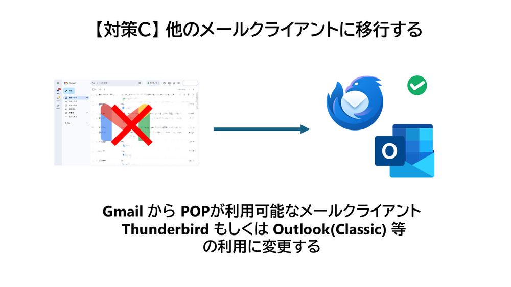 Gmailでの利用をやめてPOPが利用可能な他のメールクライアント(Thunderbird、Outlook Classic)に